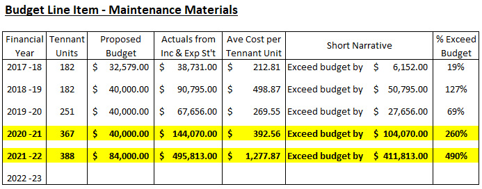 In the residents' proposed budget, for the financial year ending 30 June 2022, put forward by the Operator, the specific Line Item, 'Maintenance Materials', saw the proposed budget more than double from the previous financial year, from $40,000 to $84,000. Yet, even with this huge increase in the budget of $44,000 for a 12-month period, it failed to cover the costs of 'Maintenance Materials' for the above-mentioned financial year, blowing out to a massive $495,000.