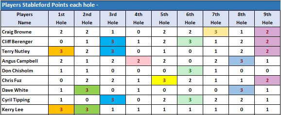 Highest score on each hole highlighted in colour. If more than one player’s score is highlighted in the same colour, it means that the hole was halved, because two players obtained the same high score. The value of that hole then jackpots to the next hole, and so on.