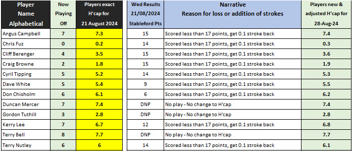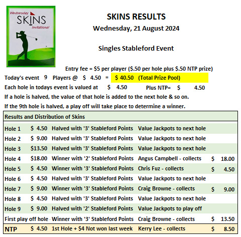 The results of Wednesday’s skins - 21 August 2024, are set out below:-