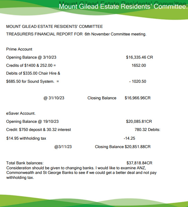 The Residents' Committee Treasurer's Report, for 6 November 2023, prepared by the Treasurer of the Residents' Committee - Anne Payne.