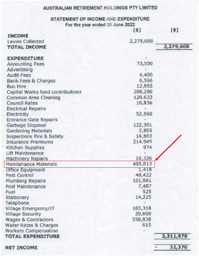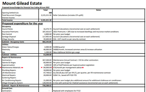 In the residents' proposed budget, for the financial year ending 30 June 2022, put forward by the Operator, the specific Line Item, 'Maintenance Materials', saw the proposed budget more than double from the previous financial year, from $40,000 to $84,000. Yet, even with this huge increase in the budget of $44,000 for a 12-month period, it failed to cover the costs of 'Maintenance Materials' for the above-mentioned financial year, blowing out to a massive $495,000.