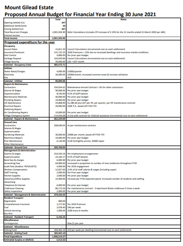 Proposed budget put forward by the Operator/Management for the year ending 30 June 2021.